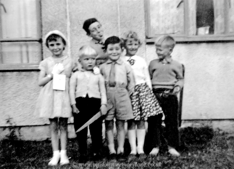 Standing in their front garden on a hot summer's day we have the Butcher children