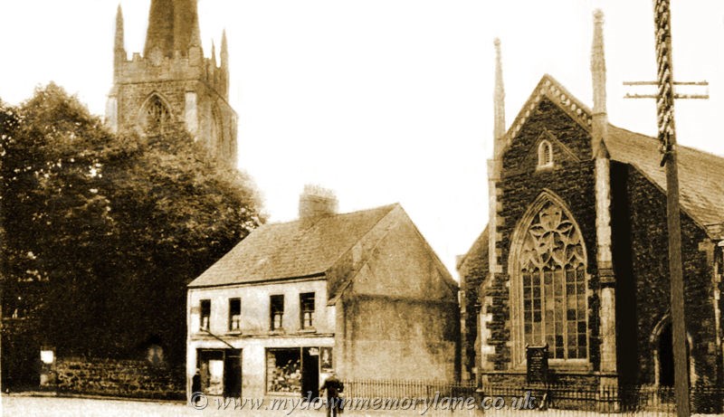 Temperance Arms Hotel. On the left of the Massereene Arms Hotel is a hardware-grocers