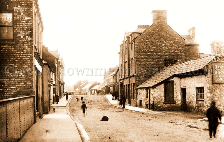 Main Street in Ballyclare in 1901. To the left the thatched cottage has